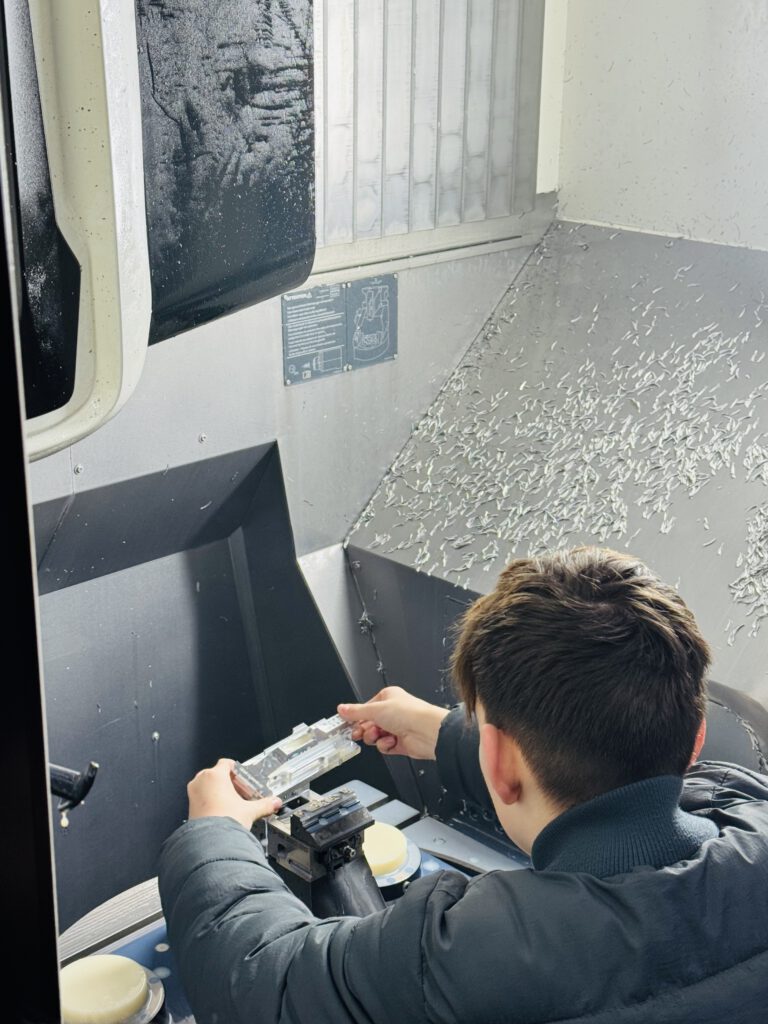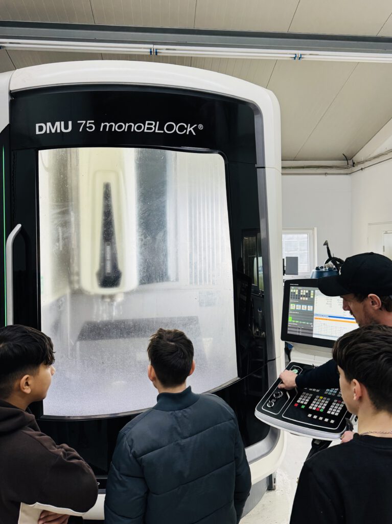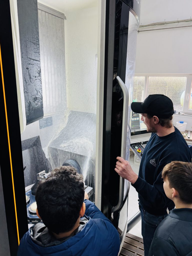 Am zweiten Projekttag wurde die Klasse von der Firma Hassenfratz Maschinenbau in Einhausen eingeladen. Das Unternehmen beliefert Betriebe aus der Region mit metallischen Bauteilen, die beispielsweise mithilfe von CNC-Maschinen gefräst oder gedreht werden. Die Schülerinnen und Schüler erhielten dabei einen anschaulichen Einblick in den Arbeitsalltag eines metallverarbeitenden Betriebs sowie in mögliche Ausbildungsberufe.